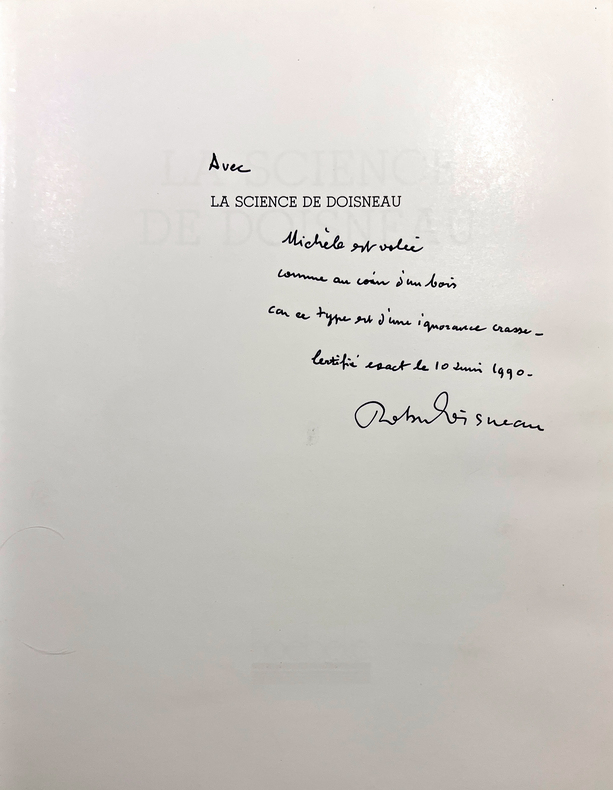 Paris, Hoebeke, 1990. Un volume in-4 (29,8 x 21,8 cm), 63 pages, reliure percalinée verte de l'éditeur titrée au dos, jaquette illustrée. Édition originale. Album de photographies de Robert Doisneau prises au Jardin des Plantes, au Musée de l'Homme et au Parc Zoologique de Paris. Texte préliminaire de Théodore Monod et table des illustrations commentées par Alain Foucault. Exemplaire enrichi d'un très bel et spirituel envoi de Doisneau : "Avec la science de Doisneau Michèle est volée comme au coin d'un bois, car ce type est d'une ignorance crasse. Certifié exact le 10 juin 1990. Robert Doisneau".