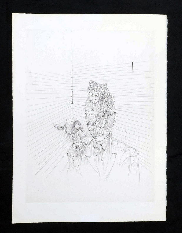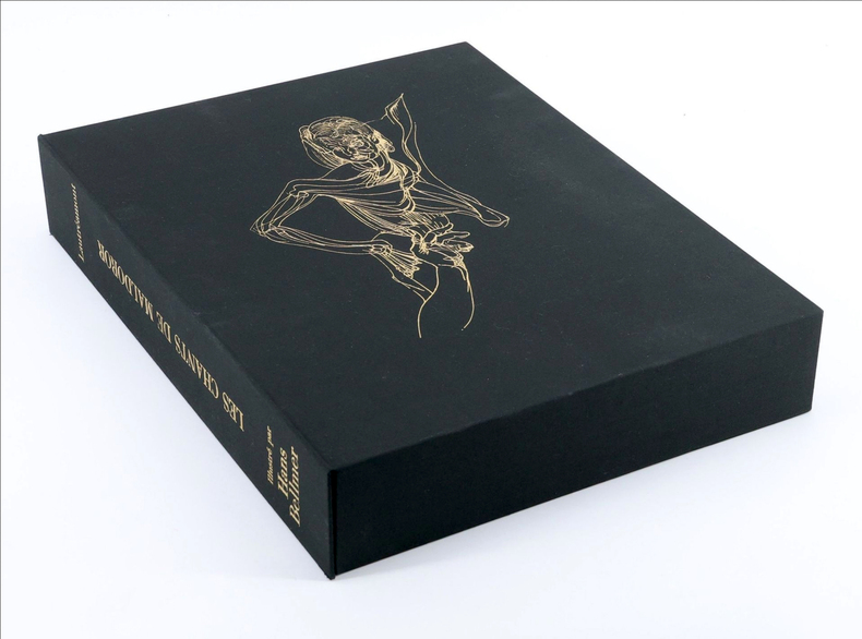 S.l. (Genève), Grafik Europa Anstalt, s.d. (1971). Un volume in-folio (385 x 287 mm), en feuilles, sous chemise toilée noire, estampée or de la signature de l'artiste. Emboitage de même nature estampé or d'une composition de l'artiste sur le front, du titre au dos. 18 EAUX-FORTES EN NOIR ET EN HORS-TEXTE (sur les 20 annoncées à l'achevé d'imprimer, comme toujours). Édition totale à 115, celui-ci n° 60, signé par Bellmer. Les planches ont été gravées par Cécile Rheims d'après les dessins originaux de Bellmer, comme la plupart des ouvrages illustrés par ce dernier (Madame Edwarda, À Sade, Petit traité de morale, Les Marionnettes, etc.)