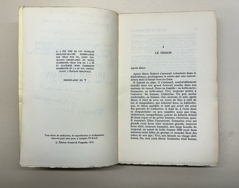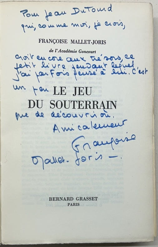 Paris, Grasset, 1991. Un volume in-8 (21,3 x 13,5 cm) broché, couverture à rabats imprimée. ÉDITION ORIGINALE. 1 des 64 exemplaires sur vélin pur fil, seul grand papier, et parmi ceux-ci 1 des 14 hors-commerce (n. V) enrichi d’un long et affectueux envoi autographe de Françoise Mallet-Joris à Jean Dutourd.