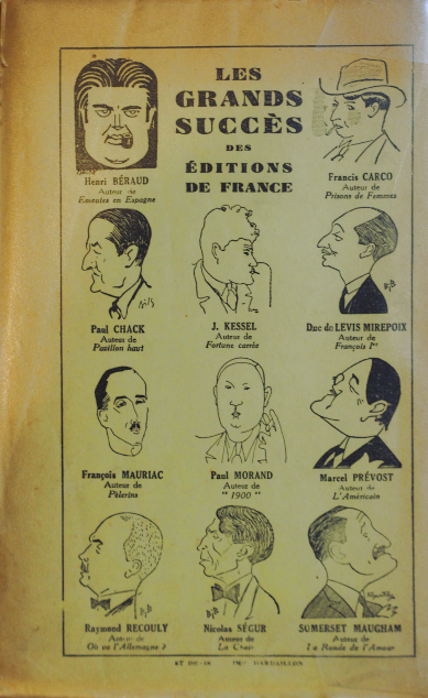 Les éditions de France, in-12° br. 1932. 268 p. 4è de couv. ill. de portraits d'auteurs. Envoi de l'auteur à Mr Jaladis. Jauni. Assez bon état d'ensemble.