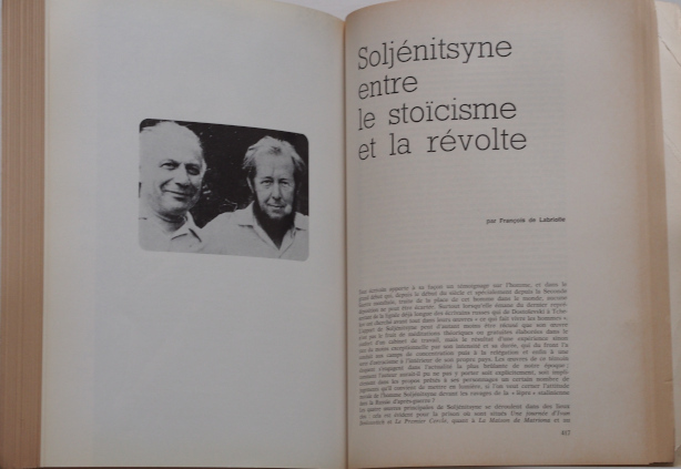 l'Herne, 1971. In-8° br. couv. ill. Série slave. cahier d'ill. (4 p.). Contient: Chronologie - Textes de Soljénitsyne - Documents - Etudes et témoignages (par Michel del Castillo, M. Aucouturier, G. Nivat, Lev Kopelev, Claude Frioux, G. Katkov, P. Denoix, Helena Zamoyska...etc) - Bibliographie (par François d'Argent) - Index. 520 p.
