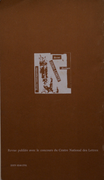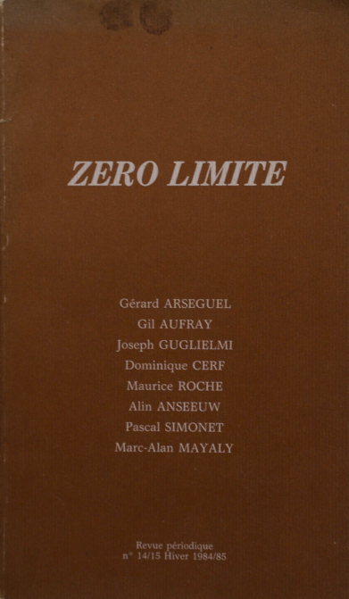 Zéro limite, hiver 1984/5. Revue périodique in-8° étroit, br. Textes de: G. Arseguel, Gil Aufray, J. Guglielmi, Dominique Cerf, Maurice Roche, Alin Anseeuw...etc, 62 p. Deux points de salissure ht de 1e de couv.
