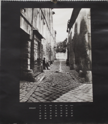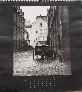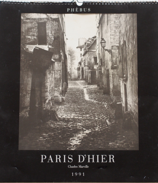 Phébus, 1990. Calendrier "Paris d'hier. Charles Marville. 1991" 48 x 43 (muni de: transparent, spirale, attache) réalisé sous la direction de Jane Sctrick et Jean-Pierre Sicre, comportant 12 vues de rues de Paris prises sous le Second Empire par Charles Marville et provenant de la Bibliothèque historique de la ville de Paris. Déchirure (6 cm), p. d'achevé d'imprimer, sans conséquence. Transparent de couv. très léger. altéré.