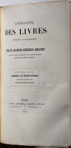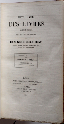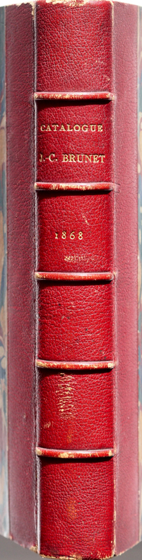 Réunion des deux parties de la bibliothèque de Jacques-Charles Brunet (1780-1867), avec préfaces d'Antoine Le Roux de Lincy. Le volume est bien complet de la table et de la liste des prix pour les 713 premiers lots. Une troisième vente eut lieu la même année, consacrée exclusivement aux autographes. Dos passé, quelques frottements.
