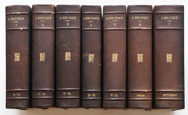 Librairie Firmin Didot Frères, Fils et Cie, 1860-1865. 1878. Sept gr. in-8° demi-rel. à coins. Quatre nerfs. Titre, tomaison dor. au dos. Cinquième édition originale entièrement refondue. 1°,Nouveau dictionnaire bibliographique (vol. I à V). 2°,Table en forme de catalogue raisonnée (vol. 6). 3°,Supplément contenant 1° un complément du dictionnaire bibliographique de M. J.-C. Brunet, 2° La table raisonnée des articles, par MM. P. Deschamps et G. Brunet.(vol. 7) L'ensemble ill. de près de deux cents marques typographiques. 950 p. env. par vol. Cachets d'un salon littéraire dans les 1è p. de chaque vol. Quelques soulignements marginaux au crayon à papier. Ex-libris et annotation manuscrite ht de p.de garde (vol. I). Assez bon état d'ensemble. Poids: 11 kg 500 env.