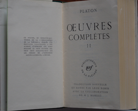 Gallimard, 1970 (1950). In-12° rel. vert antique, demi-jaquette, rhodoïd, emboîtage. Signets. Collection Bibliothèque de la Pléiade 64. Traduction, présentations et notes par Léon Robin et M.J. Moreau. 1680 p. enmboîtage en partie décollé.