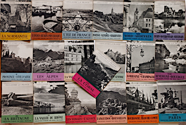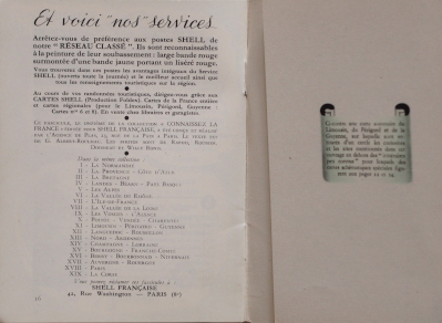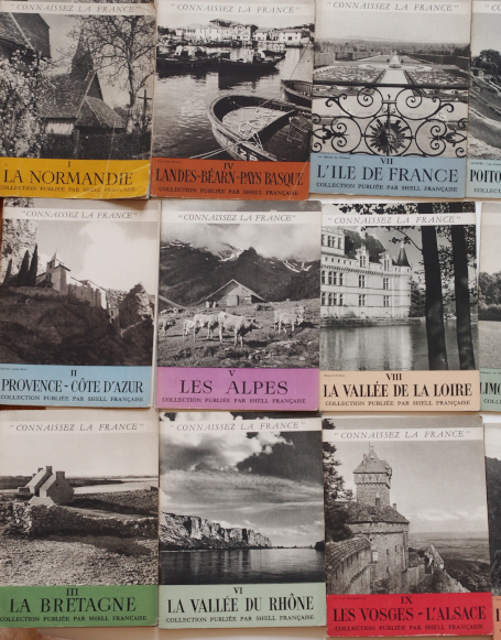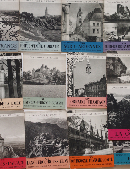 Shell française/ Agence de Plas, 1951. 19 fascicules des régions de France de I, La Normandie à XIX, La Corse in-16 agrafés, couv. ill. avec plan de la région concernée sur dépliant et comprenant des photos pleines p. (au moins 2 par vol.) et une dizaine de vignettes photo, chaque fasc. ainsi que 4 itinéraires. Photos de: Agence Rapho, A.D.E.P. Schall, Roubier, W. Ronis, Boucher, Doisneau, Belzeaux, Feher...etc. Textes de: G. Albert-Roulhac, P. Seyrat-Damarix, A. Serdac... 16 p. environ. Assez bon état d'ensemble.