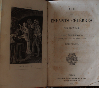 "A.-F.-J. Fréville (1749-1832), grâce à des études assidues, devint un bon latiniste, fut chargé de plusieurs éducations particulières, notamment de celle des deux fils du duc de Luxembourg, en 1785, et employa une partie de son temps à composer des ouvrages pour la jeunesse. Devenu suspect sous la Terreur, il fut traduit devant le tribunal révolutionnaire, et acquitté après une assez longue détention. Lors de la création des écoles centrales, Fréville devint professeur de belles-lettres à l'école de Seine-et-Oise, et renonça à l'enseignement public à l'époque de la réorganisation de l'Université. Comme professeur, il s'attacha à aplanir les difficultés de la langue française, et composa une grammaire simplifiée avec un bon vocabulaire d'homonymes et d'homographes. Comme écrivain, il a laissé un grand nombre d'ouvrages pour la jeunesse." (Larousse du XIXe) — T. I : Les deux jumeaux ; Marcile Euphropsine ; Henri de Nemours ; Edouard VI ; Charles, duc de Glocester ; Candiac de Montcalm ; Ambroise de Boufflers ; Louis, duc de Bourgogne ; etc. T. II : Adélaïde de Montreuil ; Angéla de la Morinière ; Vie de Jeanne d'Arc ; Le jeune Dauphin, fils de Louis XVI ; Le Roi de Rome ; Gaspard Hauser ; etc. Désormais les frais d'envoi sont de 6 € seulement pour les livres jusqu'à 1 kg (colissimo suivi), pour la France métropolitaine.