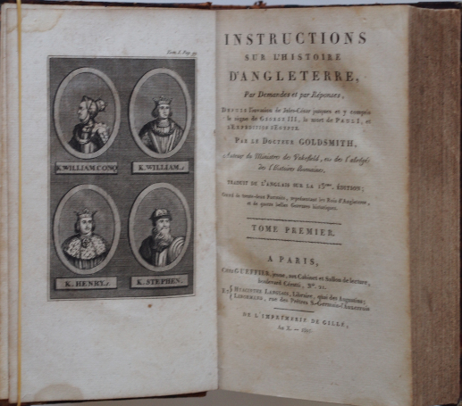 Paris, Gueffier, jeune, An X - 1801. In-8° rel. Tome premier - Tome second en un volume. Sous-titre: Depuis l'invasion de Jules-César jusques et y compris le règne de George III, la mort de Paul I et l'Expédition d'Égypte, par le Docteur Goldsmith, auteur du Ministre des Vakefield, ets des l'abrégés des l'histoires Romaines. traduit de l'Anglais sur la 13ème édition,orné de trente-deux Portraits, représentant les Rois d'Angleterre, et de quatre belles Gravures historiques. 368 et 396 pp. Etat d'usage de la couv. Etat satisfaisant de l'int.