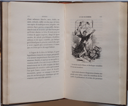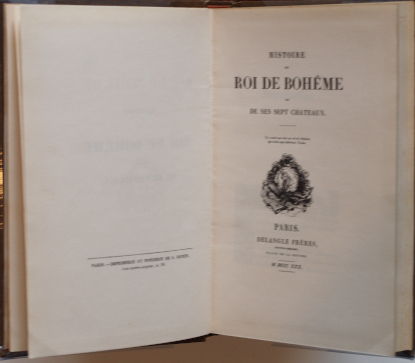 Edition originale illustrée de 50 vignettes de Tony Johannot, qui marque le renouveau de la gravure sur bois.Ouvrage loufoque et précurseur évoquant la création littéraire avec ironie. Page de titre fictive entre les chapitres 6 et 7 avec le terme « Pastiche » ajouté au titre et l’édition : chez les libraires qui ne vendent pas de nouveautés.Le dernier feuillet d'approbation, signé Raminagrobis, précise : "Je soussigné, peseur expert des idées, traducteur patenté des paroiles équivoques, despumateur juré des cogitations abstruses, exécuteur des basses-oeuvres et grand-prévôt littéraire de Tombouctou, certifie à qui il appartiendra que j'ai essayé de lire, par ordre, l'Histoire du Roi de Bohème et de ses sept chateaux; que ledit ouvragen'est ni impie, ni obscène, ni séditieux, ni satirique, et qu'il est par conséquent très médiocrement plaisant...". Barbier II, 790.Rousseurs et tâches. Papier uniformément jauni.