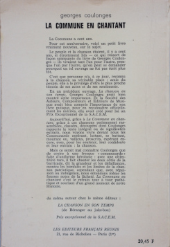 Editeurs Français Réunis 1970, in-8 broché, 227 p. (très bon état ; non réédité) Première édition. Cette petite étude parue lors du centenaire de l'insurrection présente et commente les principales chansons des Communards, "Défends-toi Paris, défends-toi", "Les damnés de la terre", "Elle n'est pas morte", "Le Temps des cerises".
