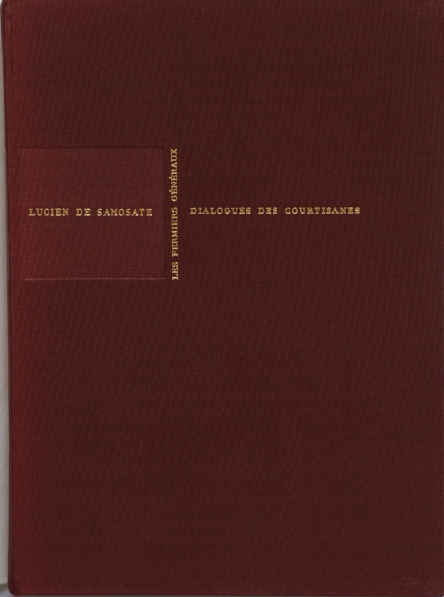 Un des 350 exemplaires du tirage numéroté sur papier du Marais (seul papier). L'Antiquité n'a jamais cessé de s'interroger sur le plaisir en ses formes diverses et ses audaces... Lucien le fait - en ces Dialogues - avec une fraîcheur dont notre époque paraît bien incapable. Les Dialogues des courtisanes constituent une anthologie du demi-monde des «irrégulières», des hétaïres dont regorge Athènes. Texte pour lequel Pierre Louÿs nourrissait une grande admiration. Légères altérations affectant chacune des coiffes; Du reste, très belle condition.