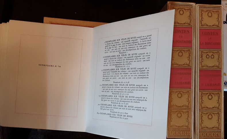 Mj. Edition Les Heures Claires, 1970. Contes de Jean de la Fontaine. Illustrés par Henry Lemarié. Trois volumes in-4 en feuilles sous chemise et coffret illustré de l'éditeur. Tirage limité à 3450 exemplaires numérotés. Exemplaire sur Vélin de Rives . Livres en très bon état, l’emboitage du tome 1 est légèrement tache, les emboitages des tomes 2 et 3 en très bon état, photos possibles.