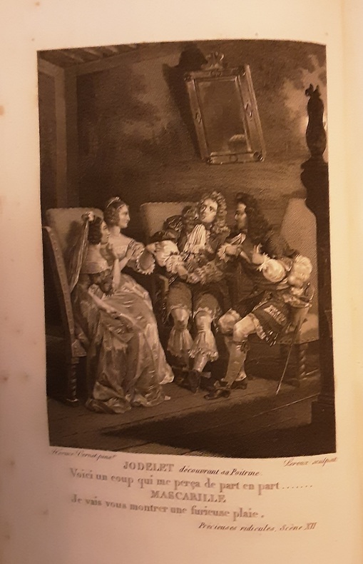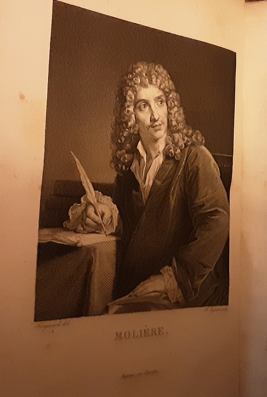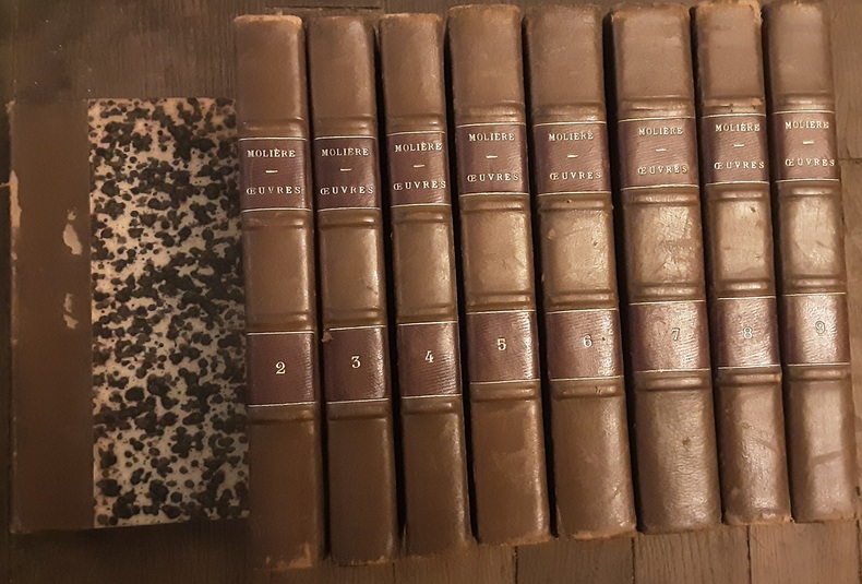 Pasc. Sj. Imprimée par desoer Paris 1819, reliure demi-chagrin marron ,plats marbrés, quelques taches de rousseurs, grand in-8 (13,5 cm X 21,5 cm), gravures pour chaque titre. Dans le tome 1 frontispice Moliere. Complet en 9 volumes. Reliures et coins frottés, toutes les gravures sont protégées par une feuille de soie. Photos possibles