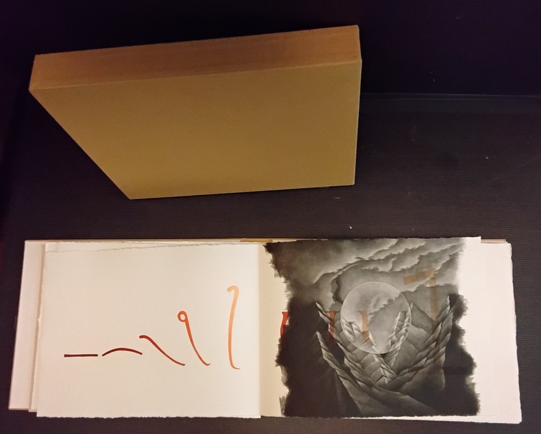 in-8 à l'italienne (20 x 27 cm), n.p. [22] f. dont 9 de planches. :: Tirage à 56 exemplaires sur papier Hannemhule 300 gr., numérotés et signés par l'artiste à la justification, comprenant 9 manière-noires et pointe-sèches gravées sur cuivre. :: En feuilles sous couverture titrée à froid, chemise et étui toilé. Bel état.