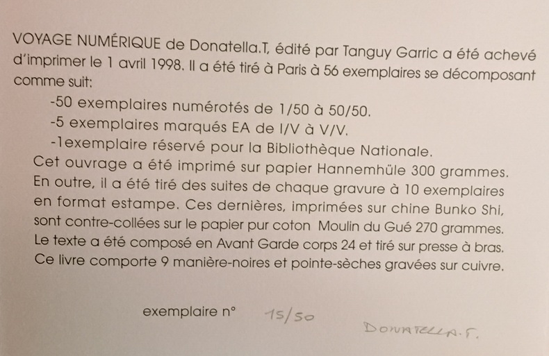 170. Edition Tanguy Garric 1998. L’ ouvrage se présente en feuilles sous une couverture toilée creme rigide. Tirage limité à 56 exemplaires. Edition numérotée 1 des 50. Une page de texte françai, non chiffré. 9 manières noires et pointes sèches. 22 x 29 cm. étui toilé crème, photos possibles