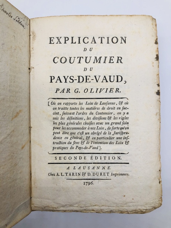 A Lausanne, Chez A. L. Tarin & D. Duret Imprimeur, 1796, in-8vo, 460 p. + 8 p. (Table), ms. sur garde ‘Broye Juge’ et sur le haut du titre ‘Au Châtelain Broye’, reliure en veau originale, dos avec pièce de titre en maroquin rouge, dos orné or. Tranches jaspées. Bel exemplaire.