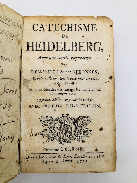 380 pp, 17 x 11 cm; quatrième édition, augmentée et corrigée de ce catéchisme de Heidelberg, avec une courte explication. Par demandes et par réponses, ajoutée à chaque article pour lever les principales difficultés. Etat moyen, rousseurs et quelques fragilités. Mais complet et tout-à-fait lisible.