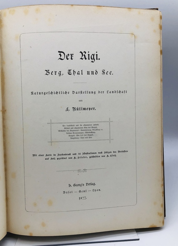 Erstausgabe einer der weniger bekannten Arbeiten des bedeutenden Berner Naturforschers, der sich vor allem als Paläontologe einen Namen gemacht hat. Die vorliegende Arbeit, bereits 1870 während eines längeren Erholungsaufenthaltes im Rigigebiet entstanden, behandelt die Geologie des Rigi mit besonderer Berücksichtigung der Erosionserscheinungen. Mit 14 Illustrationen nach Skizzen des Verfassers, davon 13 schöne Landschafts-Ansichten, plus eine farbige Doppelblattkarte: «Erratisches Gebiet an Rigi und Umgebung», Massstab 1:100'000. Vollständiges Exemplar. (Titelangabe fälschlich: mit 1 Karte u. 14 Ansichten. Inhaltsverzeichnis: 13 Tafeln u. Doppeltblattkarte (=14) Wäber BSL III/265 und Forel BSL IV, 3a (Lacs)/11; HBLS V/748, Nr. 5.