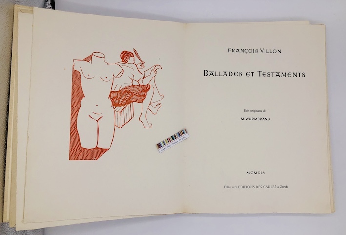 Edition de luxe au tirage limité à 60 exemplaires. Illustré de 28 lithographies originales de Pierre Stampfli. Celui-ci est un des 10 exemplaires d'artiste numérotés en romains. Il est accompagné d'une suite des lithographies tirées sur Japon. On y joint également un portefeuille rassemblant toutes les lithographies, signées par l'artiste et présentées sous couverture titrée "François Villon. Tirage d'artiste". Emboitage légèrement défraichi, sinon bel exemplaire.