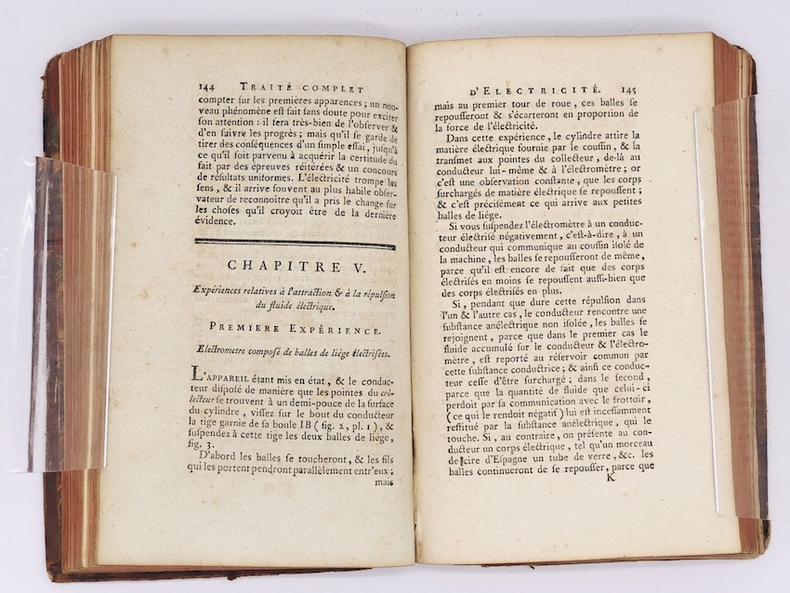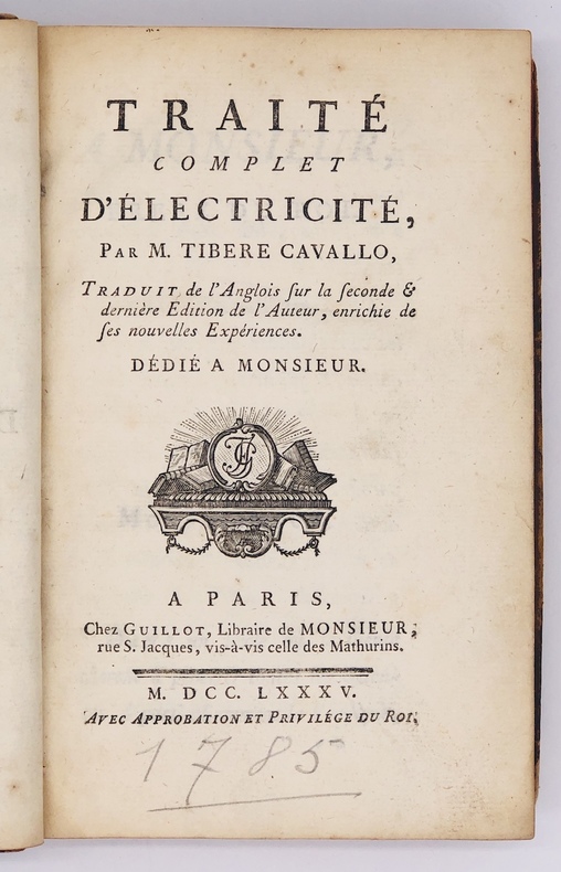 Paris, Guillot, 1785, in-8, XXIV, 343, (5)pp, 4 pl, basane marbrée, dos lisse orné, roulette et filet en encadrement sur les plats, tranches rouges (Rel. de l'ép.), 4 planches dépliantes gravées par Gerardin, représentant des expériences avec les machines de Franklin et des bouteilles de Leyde. PREMIERE EDITION FRANCAISE, traduite par l'abbé de Silvestre. Tibère Cavallo (1749-1809) publia cet ouvrage à Londres en 1777. Mouillures claires à quelques cahiers, mais néanmoins bel exemplaire XXIV, 343, (5)pp., 4 pl.