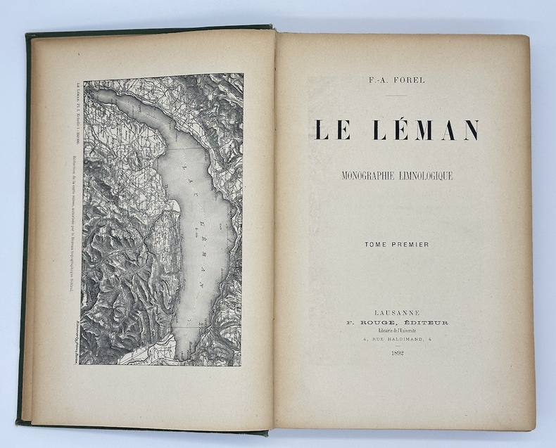 25 x 17 cm; 543 pp; 649 pp.; 715 pp. 3 tomes et volumes (complet), reliures cartonnées vertes, plats mouchetés, titres dorés au dos. Edition originale de cette célèbre étude exhaustive du lac Léman par le Prof. Forel. On y trouve des corrections manuscrites de sa main. Bien complet de sa carte dépliante. Envoi manuscrit signé de F.-A. Forel à sa fille. Minimes marques d'usure aux reliures, pages jaunies sur les bords, sinon très bel état. Ensemble exceptionnel signé par l'auteur.