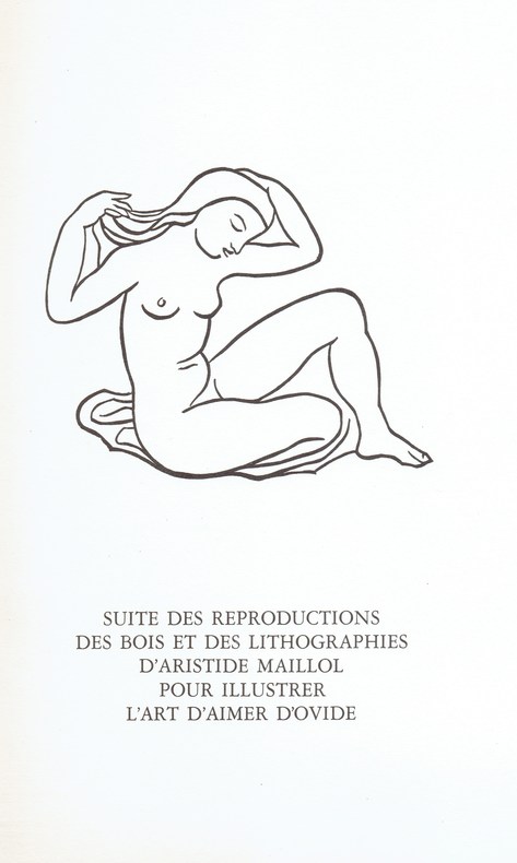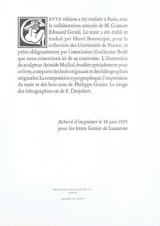 Ed. Edito-Service, Genève, s.d. (~1974), Fac-similé de l’édition des Frères Gonin, Lausanne, 1935, 25.5x35.5, 124 pages en feuillets sous couverture blanche titrée, illustrée et rempliée, tirage numéroté (N° 2225) sur papier Vélin bouffant des Papeteries de Hauteville, illustré par Aristide MAILLOL (12 ill. N/B ou sépia en pleine page + croquis), avec une suite sous couverture blanche illustrée et rempliée : "Suite des Reproductions des Bois et des Lithographies d’Aristide Maillol ..." (20 planches en N/B ou sépia), le tout sous emboitage demi-basane bordeaux, avec étui cartonné (largeur étui 6.5cm).