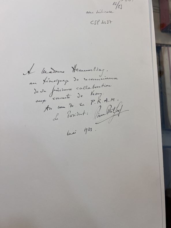 Livre offert à Mme Hemmerling en mai 1933 de la FRAM (Fédération Romande des Artistes Musiciens (voir photo) ainsi qu'une lettre manuscrite de remerciements à "Mme Hemmerling pour sa collaboration en jouant dans notre orchestre symphonique pour la Fête Cantonale des Chanteurs Vaudois à Vevey".