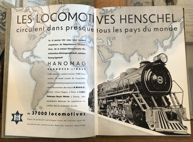 Kassel, 1931. Catalogue en français des célèbres locomotives d'Hanovre qui circulent dans presque tous les pays du monde. 160 pages, toilé lin, en excellent état intérieur, dos ayant quelque peu souffert d'humidité sans dégât apparent!