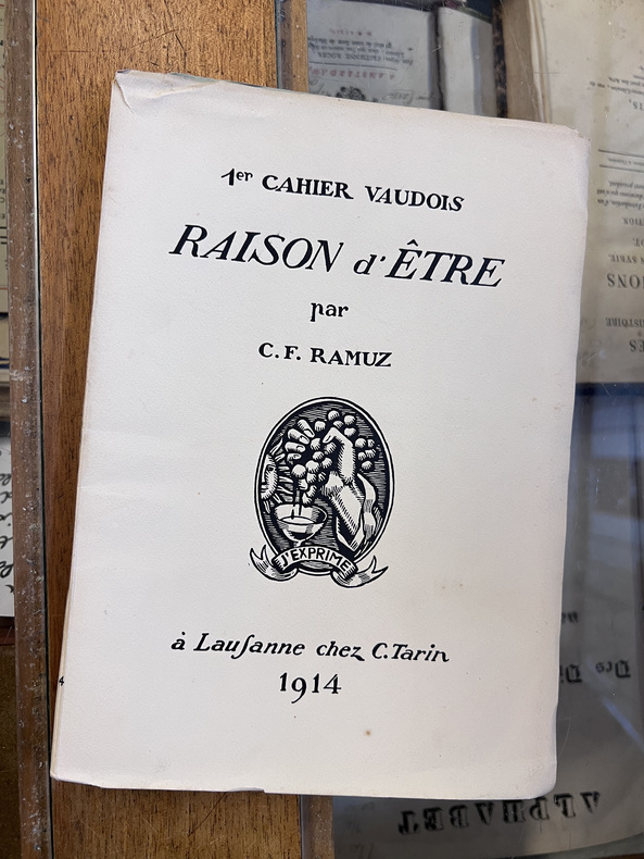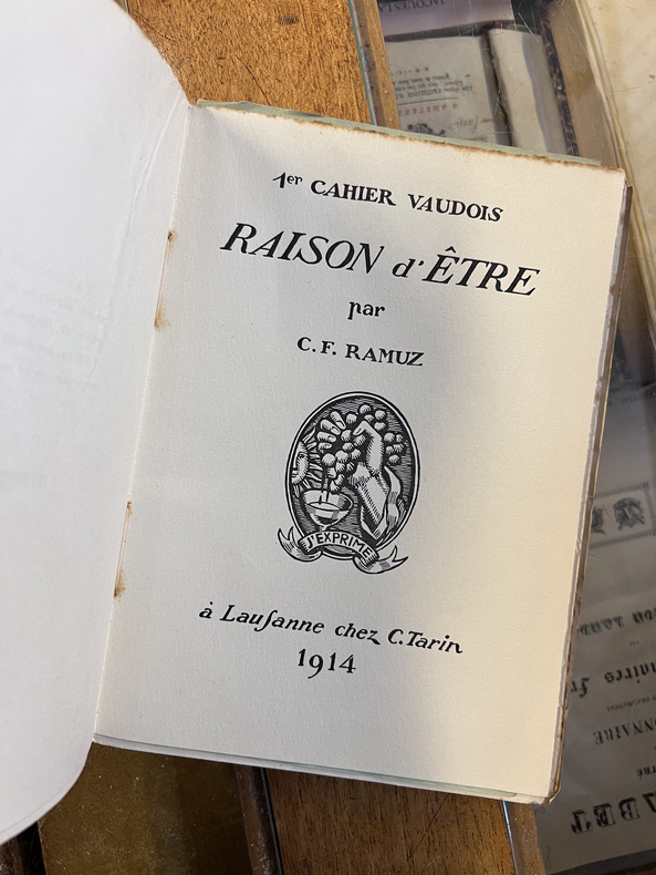 Bringolf 15. - Catalogue Nicolas Rauch, Vente 3, No 644. - Edition originale. - Unique exemplaire d'auteur h.c. justifié par la main de Ramuz (cité par Bringolf) après 20 ex. également sur papier de Hollande van Gelder. Exemplaire de Monique et Richard Heyd dédicacé le 5 janvier 1940 avec quelques lignes manuscrites. On a ajouté à la fin le catalogue des Cahiers Vaudois de 1914- 1918. À la vente Rauch l'exemplaire n'a été pas encore reliée. Richard Heyd aurait acheté aux enchères de Rauch plusieurs exemplaires qui n'avaient pas encore été reliés à l'époque et les aurait fait relier plus tard.- Avec Spitteler "Unser Schweizer Standpunkt" le texte programmatique Suisse le plus important du début du 20e siècle et d'une actualité effrayante. - Exemplaire comme raison d'être de toutes les collections de Ramuz.