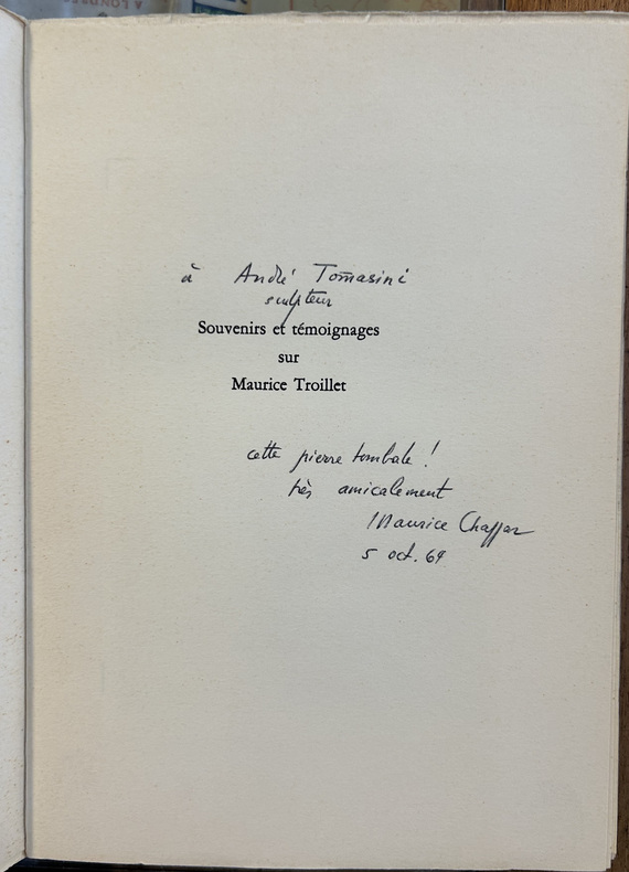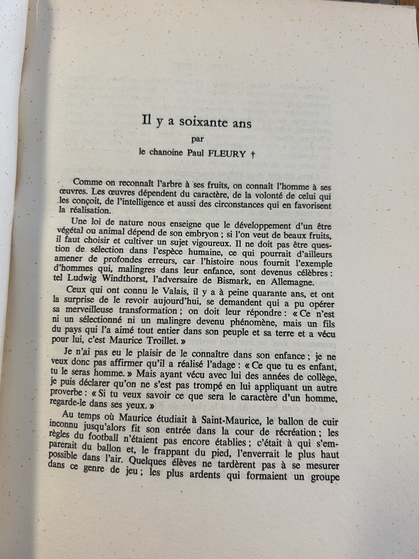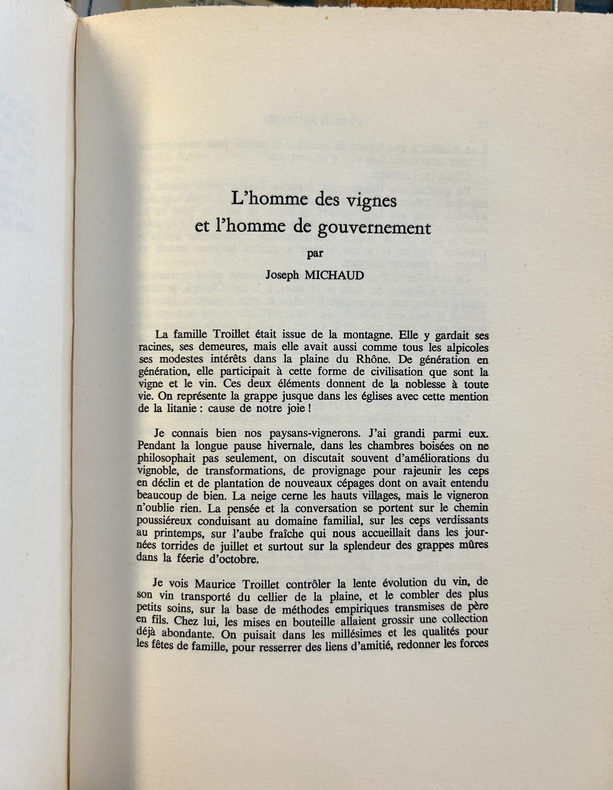 Imprimerie Moderne S.A., Sion 1964, pour le compte du Comité d'Initiative Maurice Troillet, présidé par Joseph Michaud. Les photos des hors-texte sont d'Oswald Ruppen. Exemplaire original, dédicacé par Maurice Chappaz. Recueil de témoignages de divers auteurs dont: Maurice Zermatten André Guex, Corinna Bille, Aloys Theytaz, René Payot, entre autres…