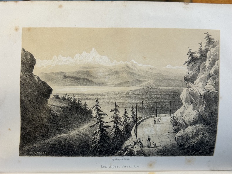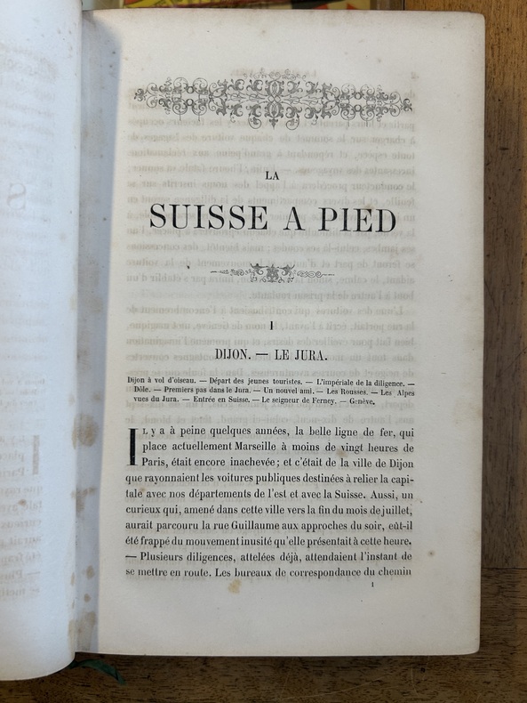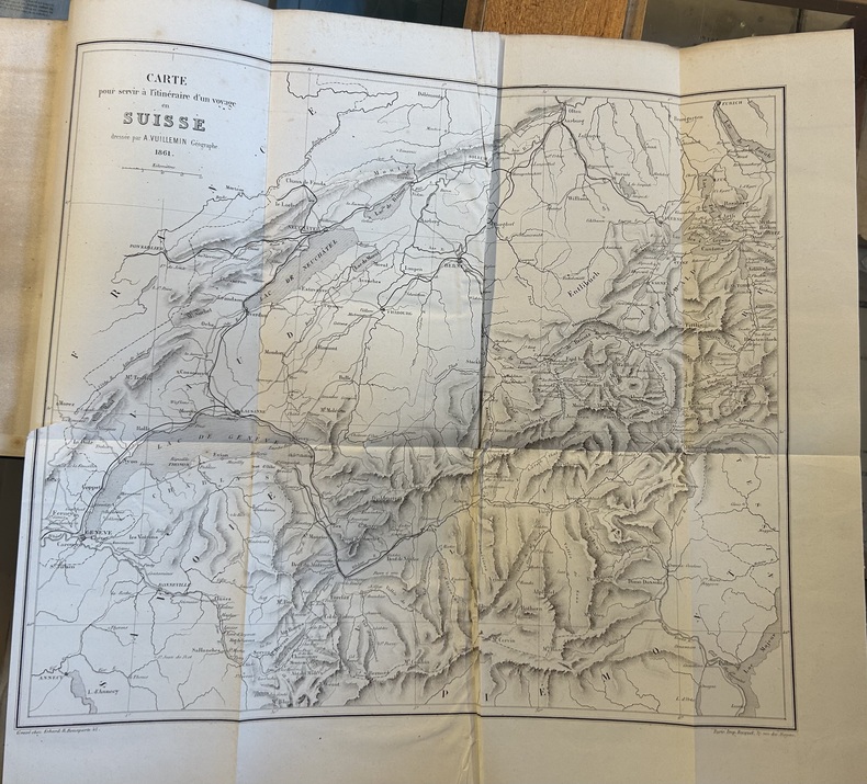 Chez Fonteney et Peltier, éditeurs. Paris sans date, aux environs de 1850-1860. Comporte 10 lithographies à deux tons réalisées par Ch. Gaildrau, plus une carte itinéraire dépliante. Au format in 8 comprenant VII, 408 pages, relié en demi chagrin d'époque, dos à nerfs avec fleurons. A noter : le voyage passe par Chamouny avec une lithographie du Mont-Blanc avec la mer de glace, et Aix les Bains. Grindelwald et une lithographie de la Jungfrau.