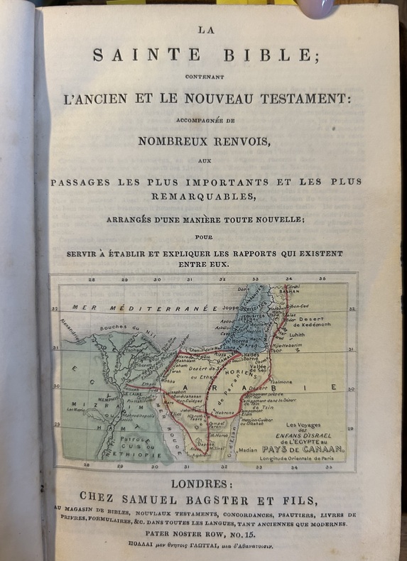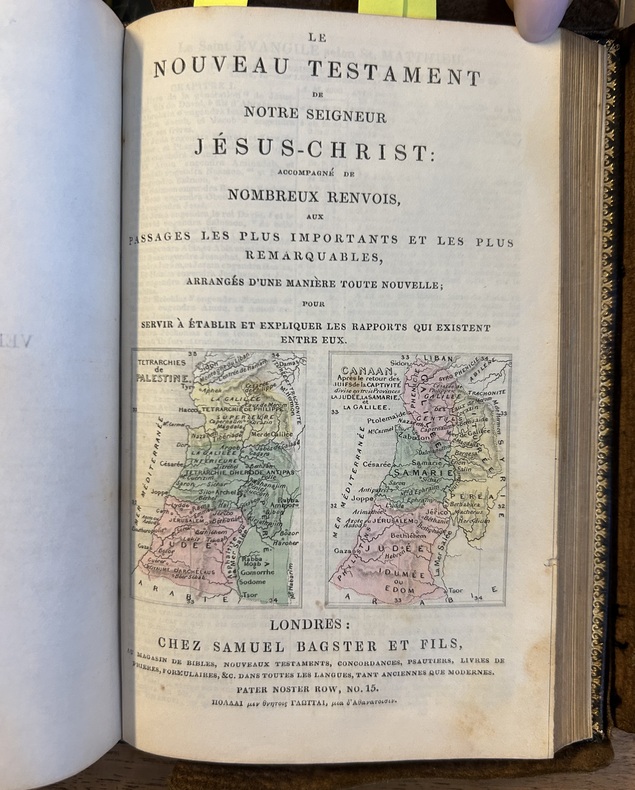 Chez Samuel Bagster, non daté mais avec une dédicace à la plume en page de garde datée du 30 aôut 1860. In-18 (9,5 x 14,5 cm), relié plein cuir, dos à 5 nerfs, caissons gravés, tranches dorées en magnifique état hormis deux petites rognures (voir photos). 585 pages + 187 pages avec 5 cartes géographiques colorées.