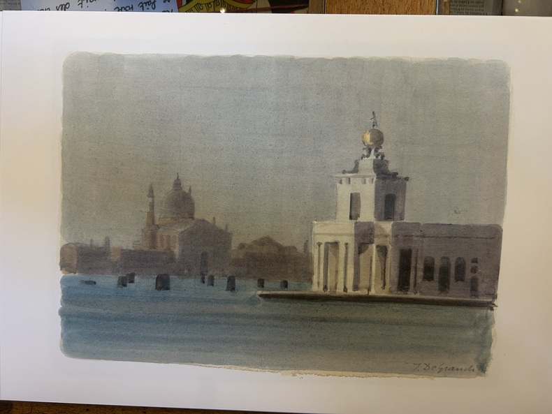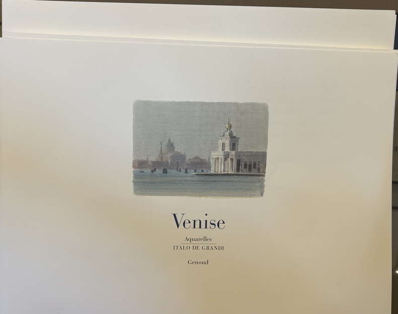 En hommage à son père Italo, Pierre de Grandi a choisi seize aquarelles de Venise qui sont accompagnées d'un texte de Jacques Chessex. Imprimé chez Genoud à Lausanne, 1993. In-folio en feuilles, à l'italienne, étui de carton.