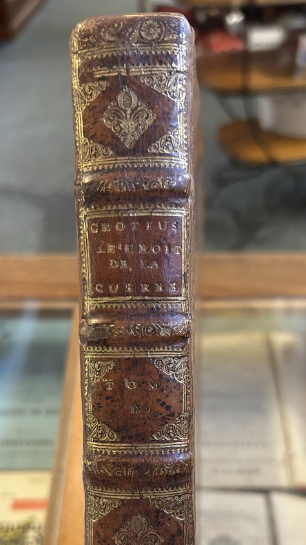 1746, Emmanuel Thourneisen, in-4 demi-cuir à coins de 518 pages, tranches rouges, Le droit de la guerre et de la paix, nouvelle traduction par Jean Barbeyrac, avec les notes de l'auteur même, qui n 'avaient point encore paru en français et de nouvelles notes du traducteur | Etat : Très mauvais état, dos et plat arrière complètement absent, plat avant très abimé, intérieur en état correct malgré les traces d'humidité et les pages abimées (Ref.: G4191)
