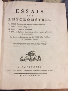 Chez Samuel Fauche Père et Fils, Imprimeurs, Libraires du Roi, Neuchâtel 1783 Ouvrage de référence dans le domaine des sciences et de la météorologie. Horace-Bénédicte de Saussure, connu pour être un des plus grand savant suisses du XVIIIe siècle, professeur de philosophie à Genève. Il est aussi l'auteur du "Voyages dans les alpes".