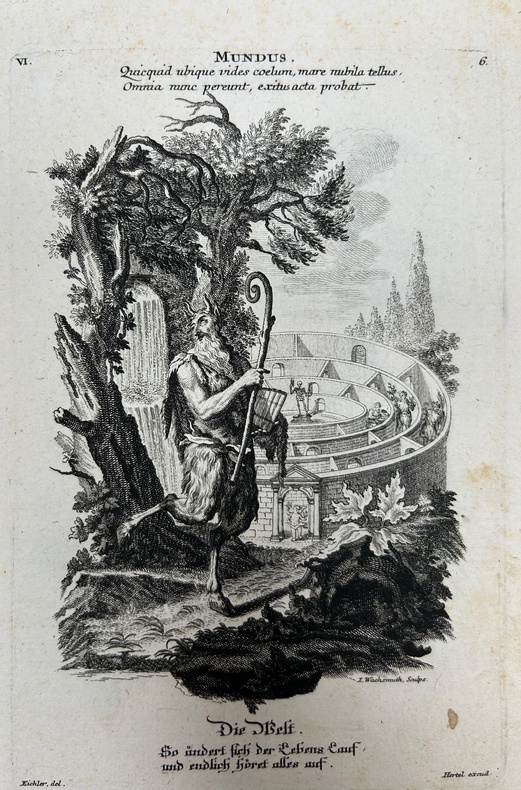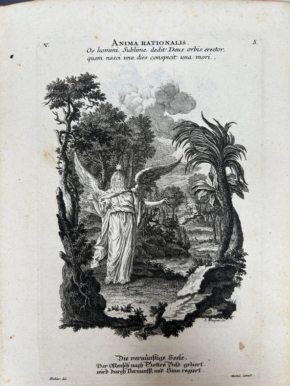 A Rococo interpretation of Ripa's emblems. Ripa's Iconologia had a great influence on artists and writers of the 17th and 18th centuries, in particular painters such as Pietro da Cortona, Gerard de Lairesse, Willem van Mieris and Vermeer. The first edition of 1593 was not illustrated and succeeding editions somehow attempted to remedy this defficiency by adding images. The best of these illustrated editions is considered to be that of Hertel. In 1748, Hertel took over part of Jeremias Wolff's art publishing house, where, in addition to his own works, he mainly published engravings of ornamental, religious and allegorical nature. The present work was issued in 10 parts of 20 plates each, including indexes in German and Latin to parts 1-5 and 6-10. The illustrations after Gottfried Eichler's drawings were etched chiefly by Jeremias Wachsmuth, with some by Emmauel Eichel, Christian Halbaur, & Jakob Wangner. In addition to the allegory, each plate has been supplied with an example of the subject represented, usually taken from the Bible or Classical writers. The allegorical figures or scenes are set in charming architectural landscapes, showing ruins, cottages, temples etc., some with rocaille staffage. Each plate is explained in a Latin title at head and a German couplet at foot. A fine copy on heavy laid paper. Berlin Cat. 4595; Landwehr 505; Praz p. 473f.