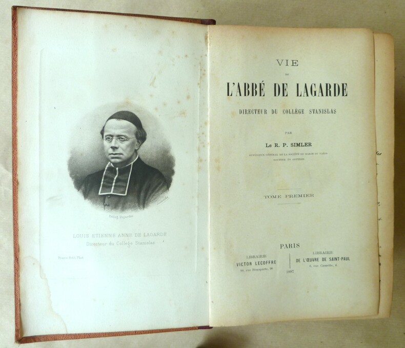 Bon état (dos lég. frotté). L'abbé de Lagarde, membre de la Société de Marie (congrégation des Marianistes) fut directeur du Collège Stanislas (Paris) de 1871 à 1884. L'auteur, le Père Joseph Simler (1833-1905) reste surtout connu comme le Supérieur des Marianistes, de 1876 à sa mort. Mais, avant d'être élu à cette fonction, il avait d'abord travaillé plusieurs années au collège Stanislas, où il avait été le collaborateur de l'Abbé de Lagarde.