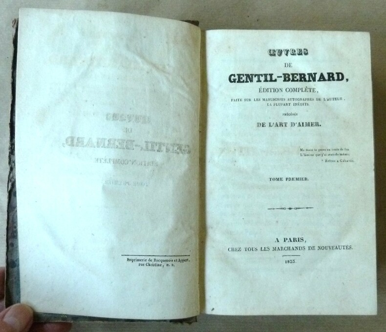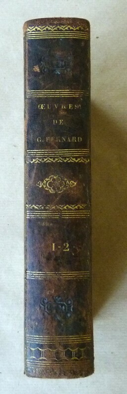 Paris chez tous les Marchands de Nouveautés 1833 Deux volumes in-8°, 31 (1) 348 et 317 pp. Reliure d'époque en demi-basane, dos à faux nerfs orné, pièces de titre et de tomaison, filets et roulette dorés. (petites tâches sur les dos, petit manque de cuir à un mors en pied de dos, les feuillets sont en désordre entre les pages 48 et 65 au tome premier, des rousseurs pâles aux feuillets du tome second et sur le titre au tome premier sinon intérieur frais). Jolie impression sur papier vergé. Pierre-Joseph Bernard (1708-1775), poète et dramaturge français, membre de la Société du Caveau, célèbre goguette parisienne. Peu courant.