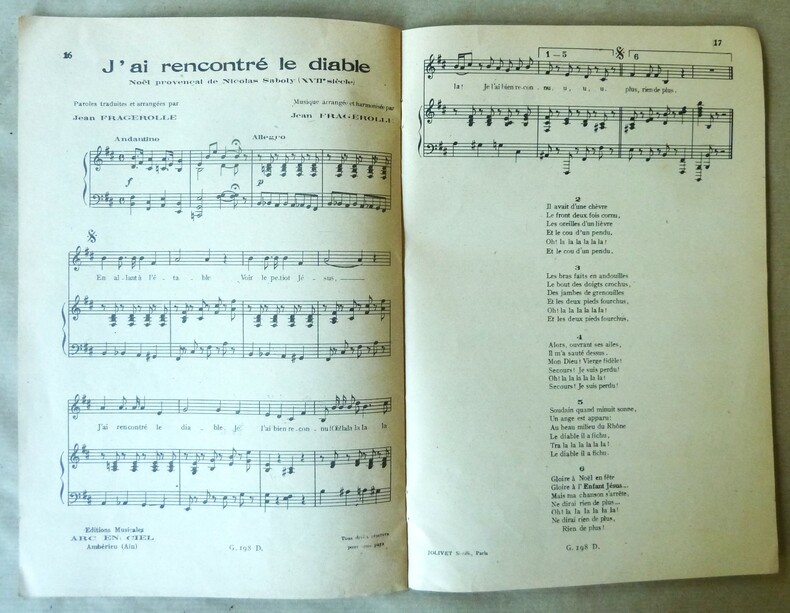 Parfait état. Voici le détail des partitions du recueil: Noël au Village (Gaston Chandivert); Le Noël de la Paix (Farémont et Goyatton); Noël des "Gentils Pastoureu" (XVIIe siècle, Noël provençal); Venons à la Crèche (Colas et Singéry); Amenez votre Musette XVIIe siècle (Fragerolle); Les Chercheurs d'Etoiles (Amiot et Goyatton); J'ai renconté le Diable (XVIIe siècle, Noël Provençal, Fragerolle); Noël de Grand'Mère (Colas); Noël e Jasseron (Noël Bressan, Fragerolle); Noël Bauceron (Chenal et Fragerolle).
