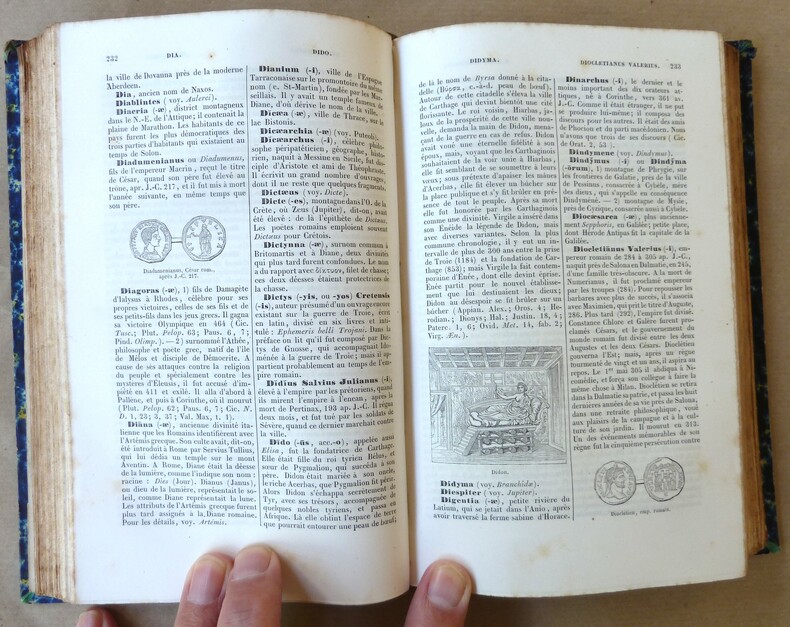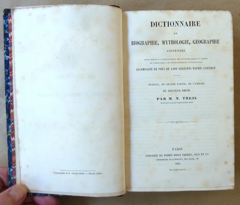 Paris Librairie de Firmin Didot et Cie 1865 in 8 (19,5x12) 1 volume reliure demi chagrin rouge de l'époque, dos à nerfs soulignés de filets dorés, plats de percaline rouge ornés d'un double encadrement à froid, plat supérieur orné d'un fer doré du Lycée du Hâvre, tranches dorées, III et 675 pages, avec de nombreuses figures dans le texte d'après l'antique, quelques rousseurs éparses sur les premières pages. Texte sur 2 colonnes. Traduit en grande partie de l'anglais de Villiam Smith par N. Theil. Première édition. Bon exemplaire