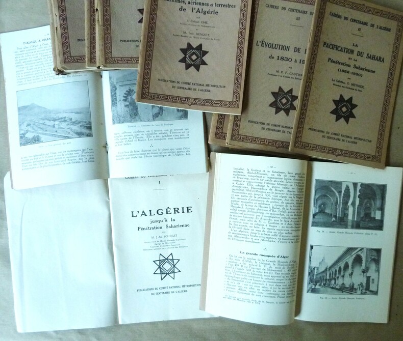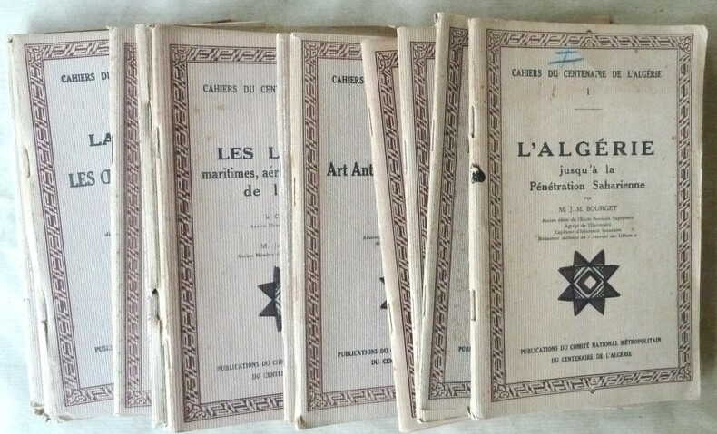 1930 Publication du Comité National Métropolitain du Centenaire de l'Algérie, vers 1930. Ensemble de 12 volumes brochés de format petit in 8° de chacun100 pp.; environ. Très nombreuses illustrations, cartes en couleurs...