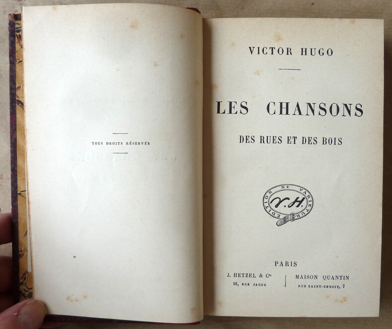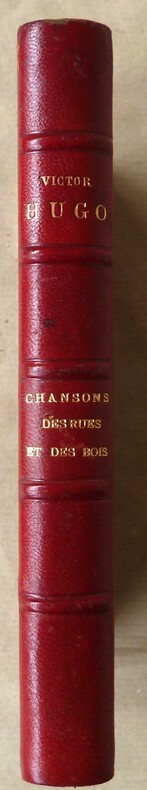 Victor Hugo, Les Chansons des rues et des bois, librairie internationale A. Lacroix, Verboeckhoven et Cie, 1865, édition originale, belle reliure d'époque. Légères rousseurs sur une page de faux-titre et la fin de la table des matières (voir photos), à part cela très bon état. Il s'agit de la toute première édition originale, publiée en Belgique en 1865. Ce recueil a été publié ensuite chez le même éditeur en France en 1866.