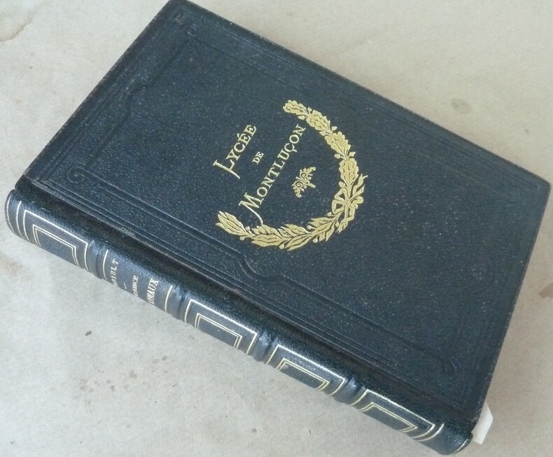 1890 Paris, Hachette, 1890. Bibliothèque des Merveilles. Un volume de format in 12 de XX, 344 pp.; nombreuses et charmantes illustrations en noir, in et hors texte. Reliure en demi chagrin anthracite, dos à 4 nerfs, caissons dorés, titre doré. Encadrements estampés à froid sur les plats de percaline noire. Au 1er plat, couronne de lauriers dorés avec la mention "Lycée de Montluçon". Etiquette de prix au dos;