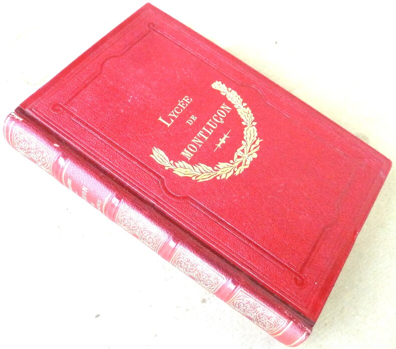 1892 Paris, Hachette et Cie, 1892. 9e édition. Un volume de format in 12 de 2 ff., 416 pp. Reliure de l'époque en demi chagrin rouge cerise; dos richement orné de caissons dorés, titre doré. Plats de percaline rouge, encadrements estampés à froid; au 1er plat couronne de lauriers dorée, mention "Lycée de Montluçon"; au verso, étiquette de prix.