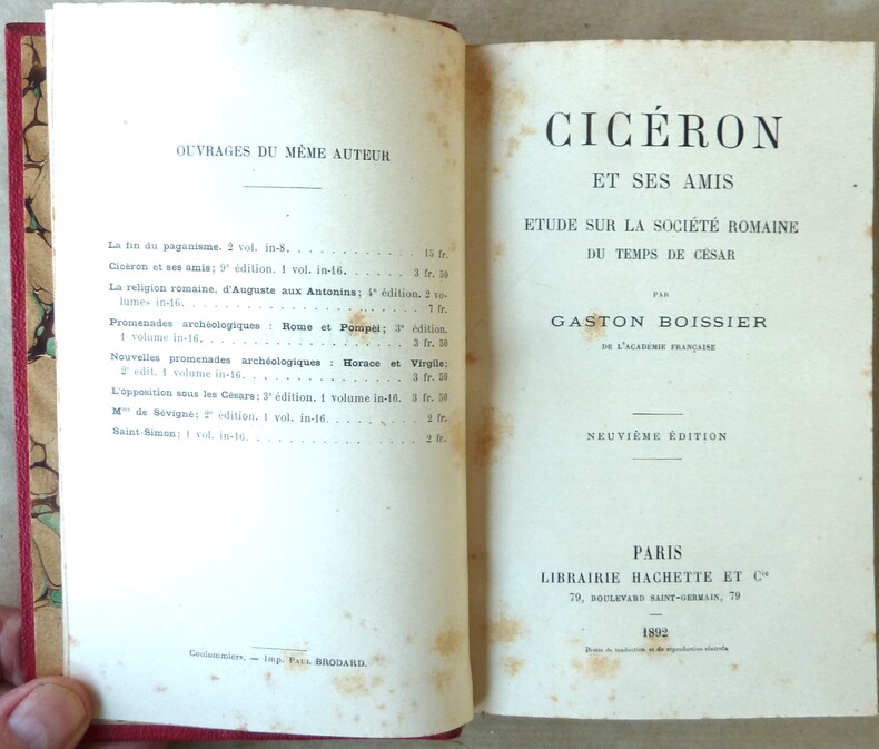 Table: Cicéron dans la vie publique et privée - Atticus - Caelus, la jeunesse Romaine du temps de César - Brutus - Octave, le testament politique d'Auguste - Le camp de César et Cicéron dans les gaules - Le vainqueur et les vaincus d'après Pharsale. vol relié, in8, 180x140, demi toile, très bel état intérieur, 412pp. Ex-libris. Paris, Hachette 1905 ref/120