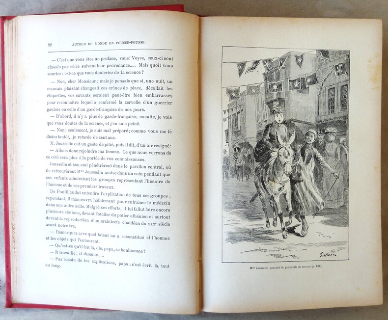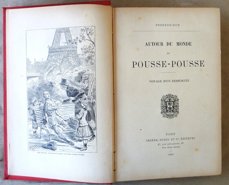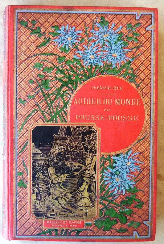 1892 Paris, Lecène Oudin et Cie, 1892. Un volume de format in 8° de 320 pp.; nombreuses illustrations pat Gilles Baer. Cartonnage de l'éditeur en pleine percaline rouge, fabriquée pour le Lycée de Montluçon. Au 1er plat riche décor "art nouveau", feuillages verts, fleurs bleues, médaillon pour le titre, superbereprise en noir et or de l'illustration du frontispice avec la Tour Eiffel en fond.