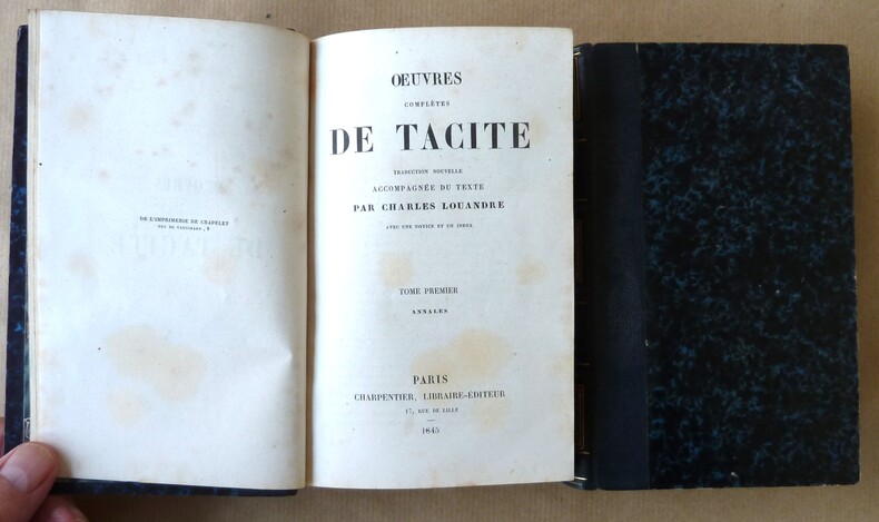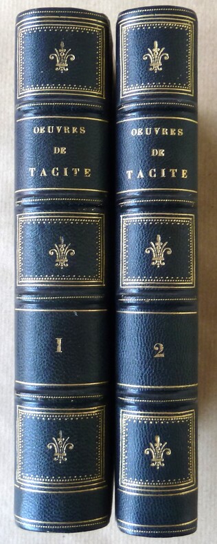 Volumes très bien reliés, intérieurs frais; bel exemplaire. Contient: Annales, Histoires, Vie d'Agricola, Moeurs des Germains, Dialogue sur les orateurs.