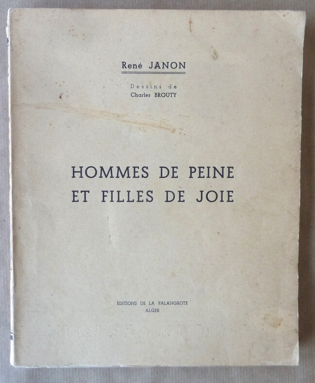 Editions de la Palangrote, Alger, 1936. Edition originale. Tirage limité à 2250 exemplaires, celui-ci l'un des 50 de tête sur Pur fil complet du carton original d'un des dessins de Charles BROUTY, illustrateur de ce livre. Dessin représentant un souteneur et une prostituée, à l'encre de Chine, 21x18, et qui servira à l'illustration de la page 83. Envoi autographe signé de l'auteur à l'industriel Robert BOUSSAC, "affectueusement, ce petit livre d'un de leurs "garçons d'honneur" [?]. Puisse cette prose ne pas le déshonorer à vos yeux". Reliure grand in-8 demi chagrin orangé à coins, dos lisse et insolé, lettrines or, couvertures conservées, piqûres éparses sur les 15 premières pages sinon bel état.