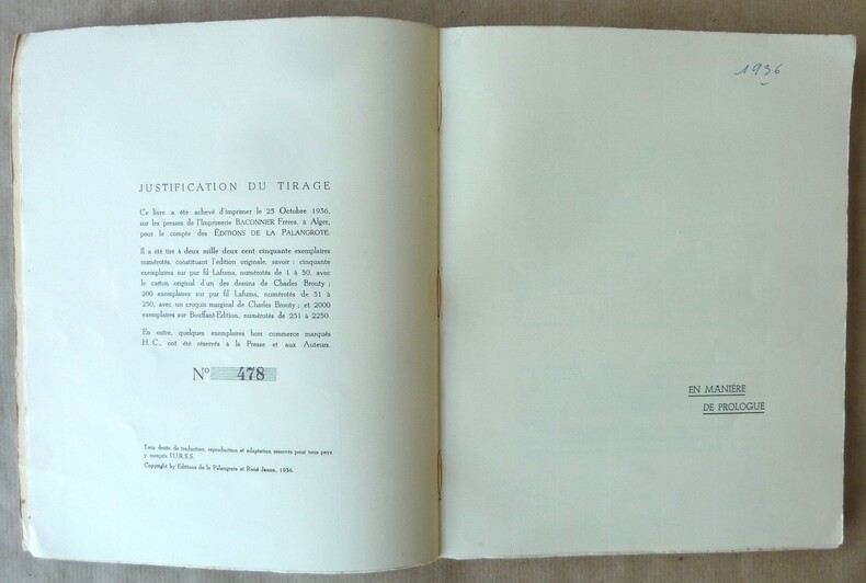 Alger, la Palangrote, 1936, in-8, 118pp, broché, Exemplaire en parfait état de l'édition originale sur papier d'édition. 118pp